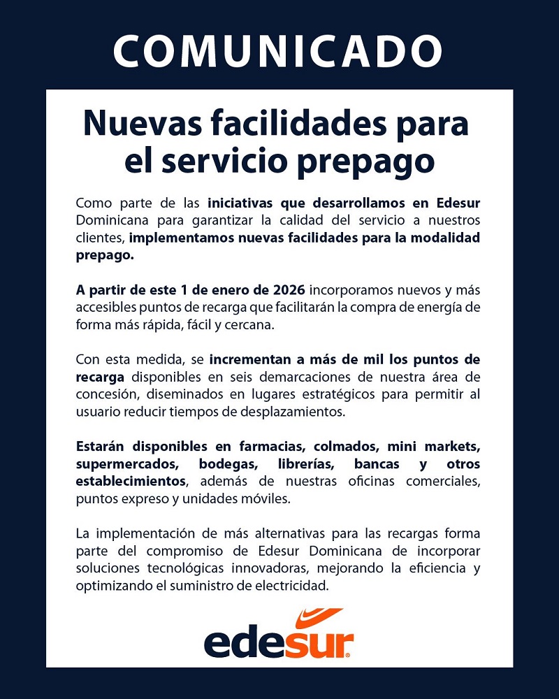 Como parte de las iniciativas que desarrollamos en Edesur Dominicana para garantizar la calidad del servicio a nuestros clientes, implementamos nuevas facilidades para la modalidad prepago.