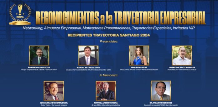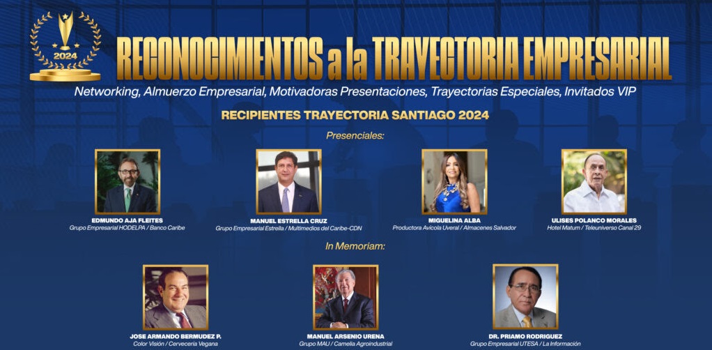 Los “Reconocimientos Trayectoria Empresarial Santiago 2024”, tendrán como recipientes presenciales al licenciado Edmundo Aja, Presidente del Grupo Empresarial Hodelpa, con diversos hoteles y empresas turísticas en principales polos turísticos de República Dominicana, así como al ingeniero Manuel Estrella Cruz, presidente Grupo Empresarial Estrella y de Multimedios CDN-El Caribe, entre otras reconocidas inversiones, con empresas en los sectores construcción y energía. También, la arquitecta Miguelina Alba, presidenta de Productora Avícola y Porcina Uveral, como de Almacenes Salvador, y el señor Ulises Polanco, fundador de Teleuniverso, y exitoso hotelero del tradicional Hotel Matum.