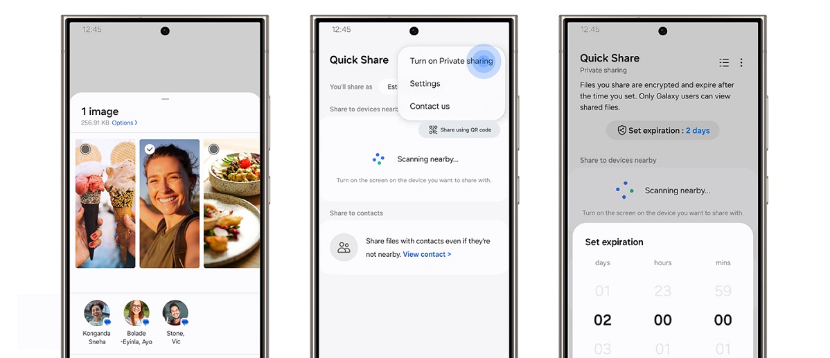 El Samsung Galaxy tiene una solución integrada para este problema: El Uso compartido privado de Quick Share, una función para compartir archivos que preserva la privacidad y que te permite compartir tus datos con tranquilidad.